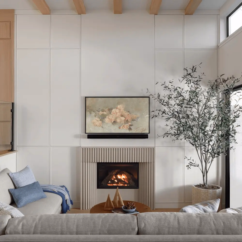 The Britannia 60″ fireplace surround in Smoothcast Simply White is featured in this beautiful makeover by Studio McGee on Netflix’s Dream Home Makeover. The height of the Britannia legs is increased to fit better with the tall wainscoting.