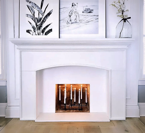 The mantel is installed in Simply White color in a Smooth finish. Since her home is in Florida, Galey just wants the visual warmth of a fireplace, so she put in a candle set for that flickering fire effect. It’s a home from 1928 and she didn’t want to get rid of the real fireplaces. Instead the candles allow her to enjoy the fireplace without impact to her electrical bill.